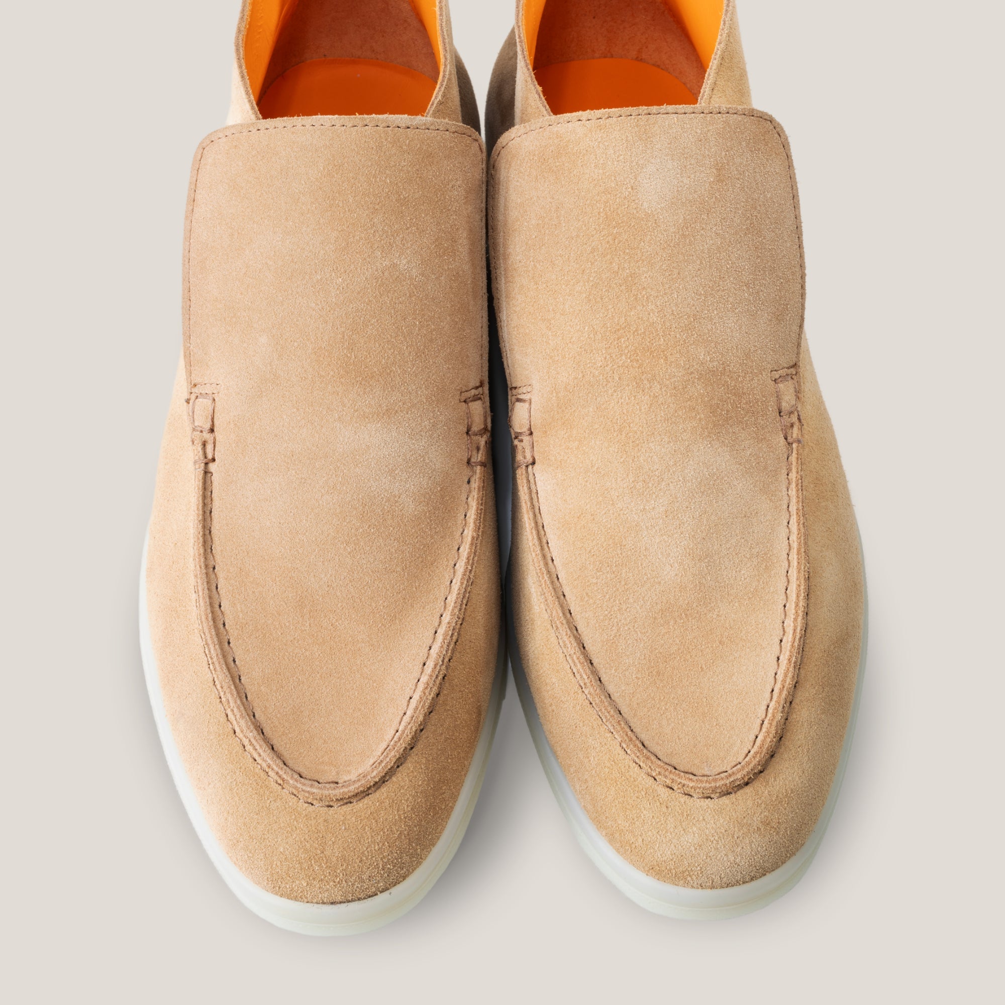 Understated and effortlessly refined, the Andora loafer in light beige suede is a masterclass in minimalist design. Handcrafted for comfort and ease, this slip-on style pairs a soft, unlined suede upper with a clean natural rubber sole—lightweight, flexible, and ideal for daily wear.