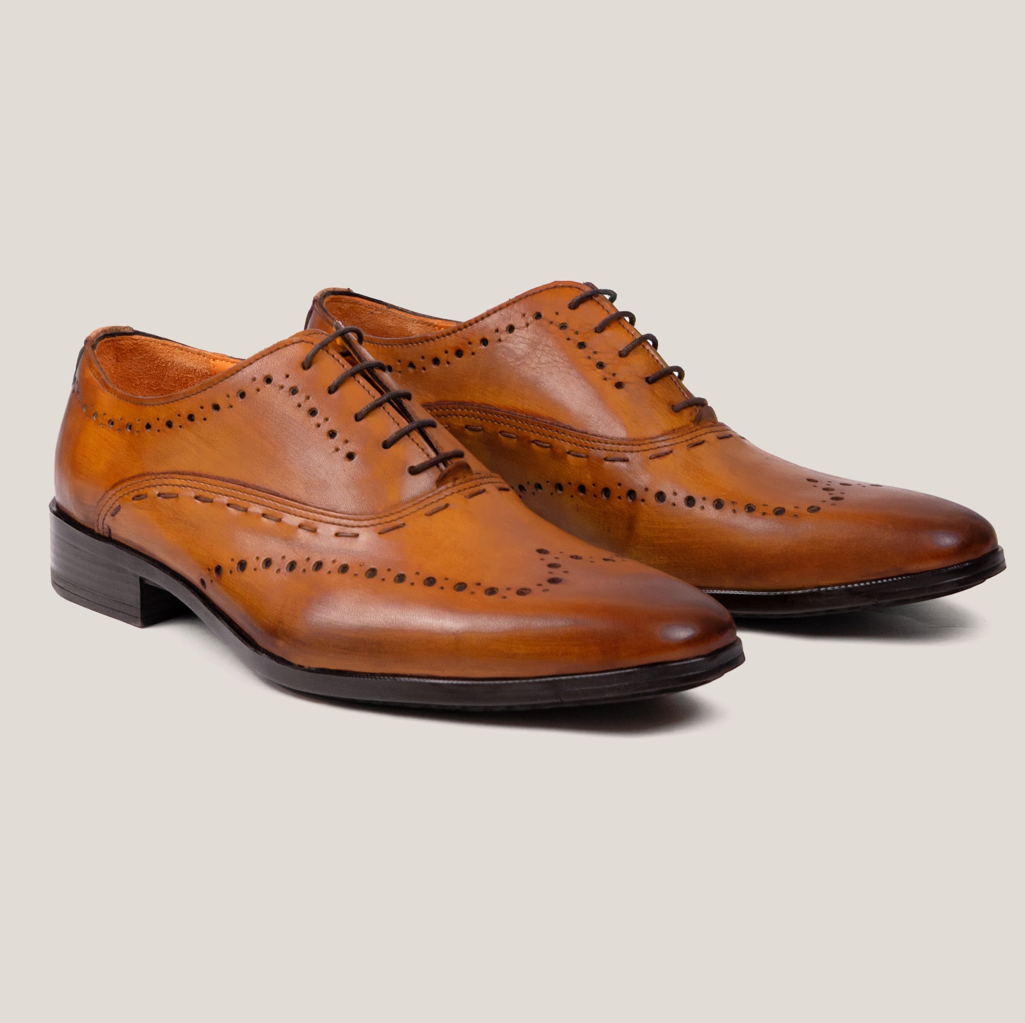The Naples Oxford represents a modern interpretation of the classic brogue, handcrafted in Italy with hand-dyed cognac brown leather. Each pair features elegant decorative broguing and a rich antique light patina that develops a unique character over time. The refined silhouette combines traditional craftsmanship with contemporary comfort, making it versatile enough for both formal occasions and business wear.