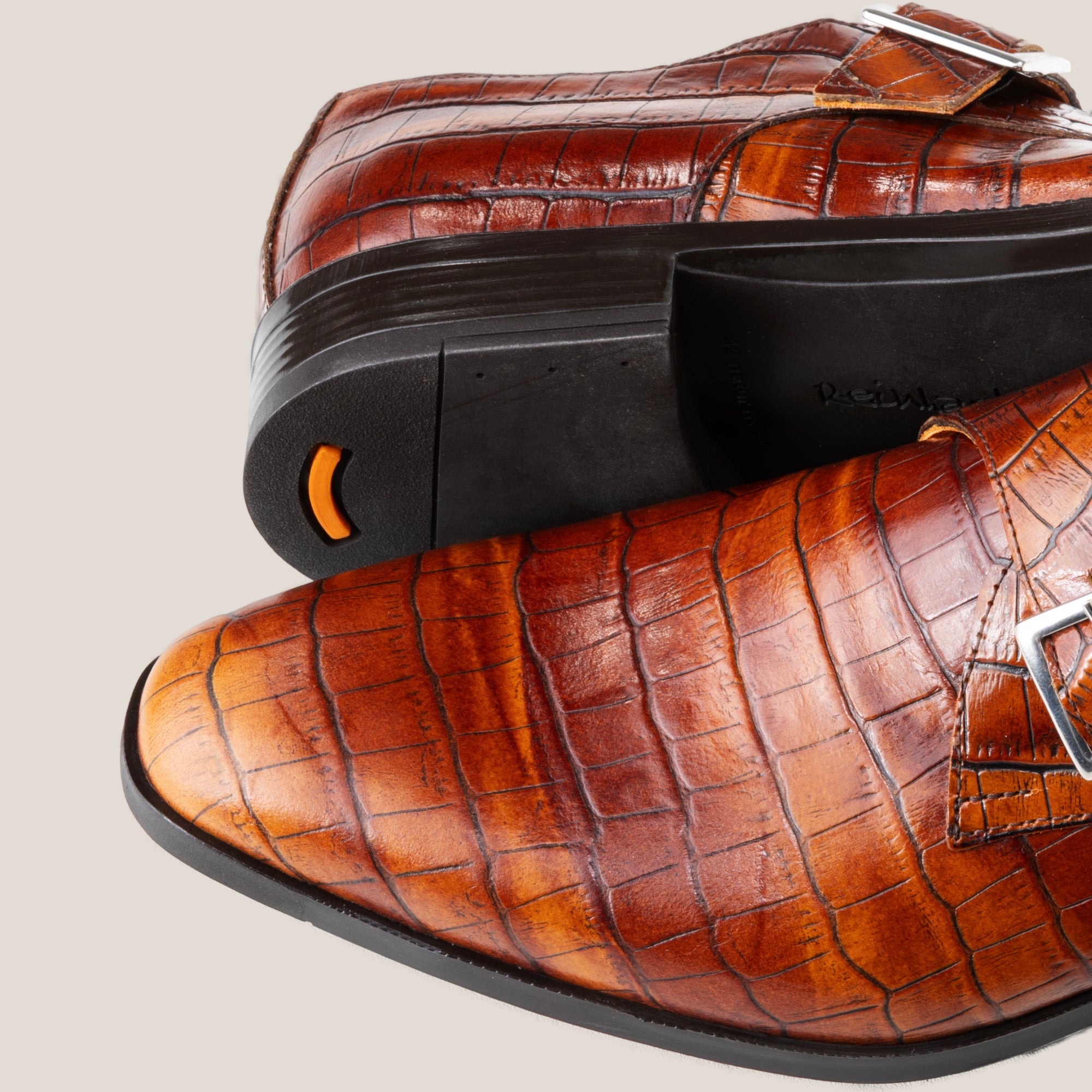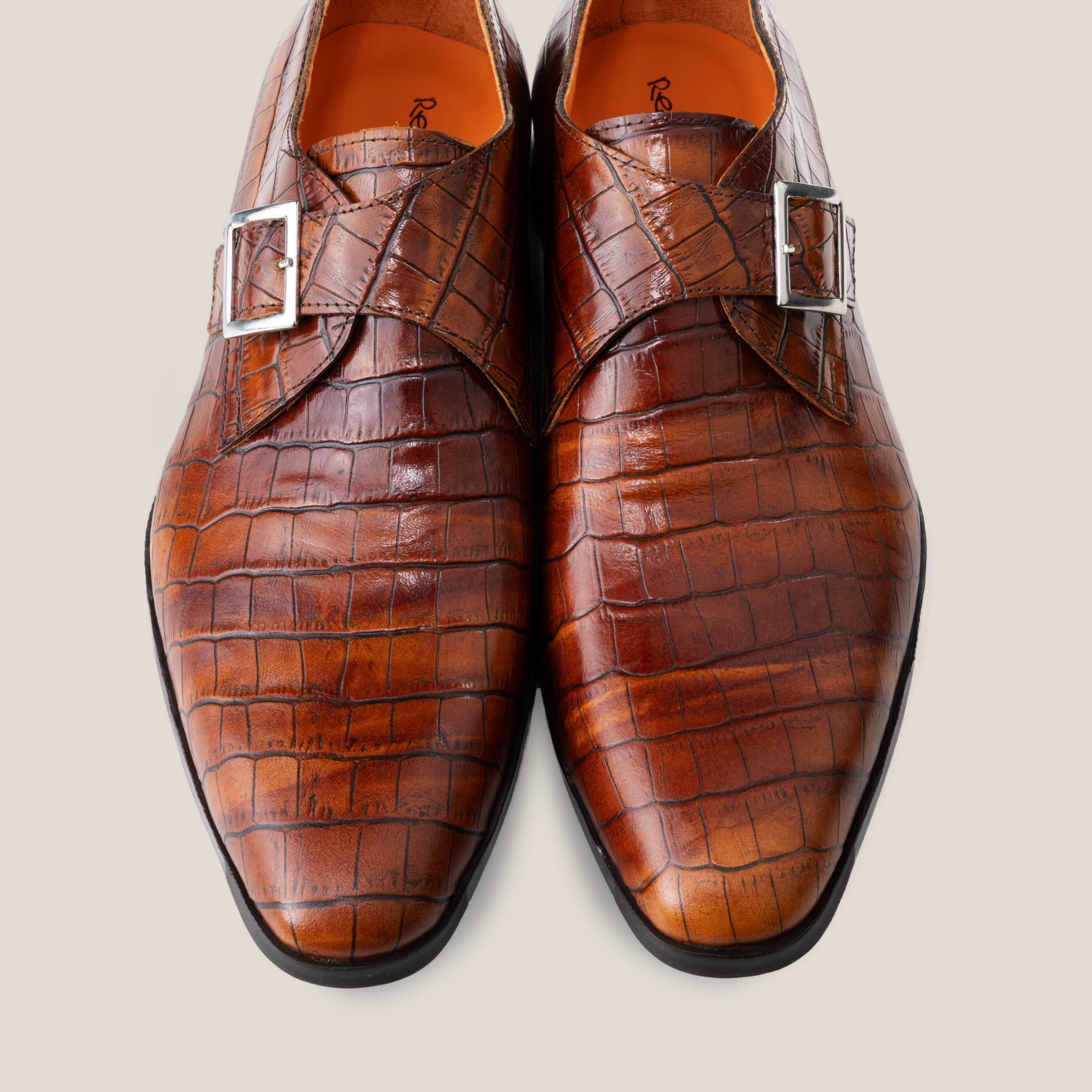 The new "NY24" Single Monkstrap in light cognac brown, hand patinated on a crocodile pattern stamped leather . Reinhard Frans’ most popular and classic style. Using an all-round toe-shape and a masculine square buckle this single monks trap has been our best selling style since the early beginning.