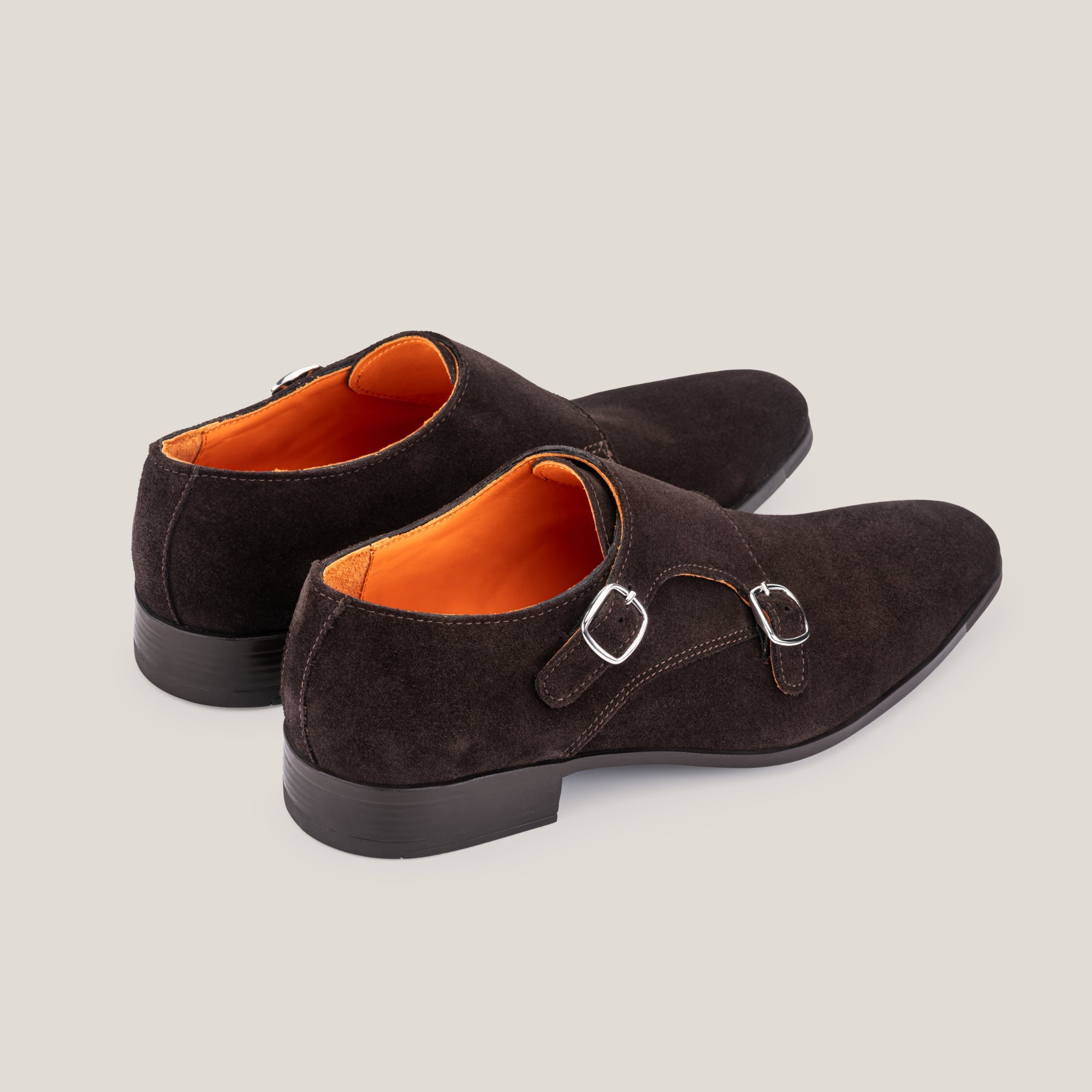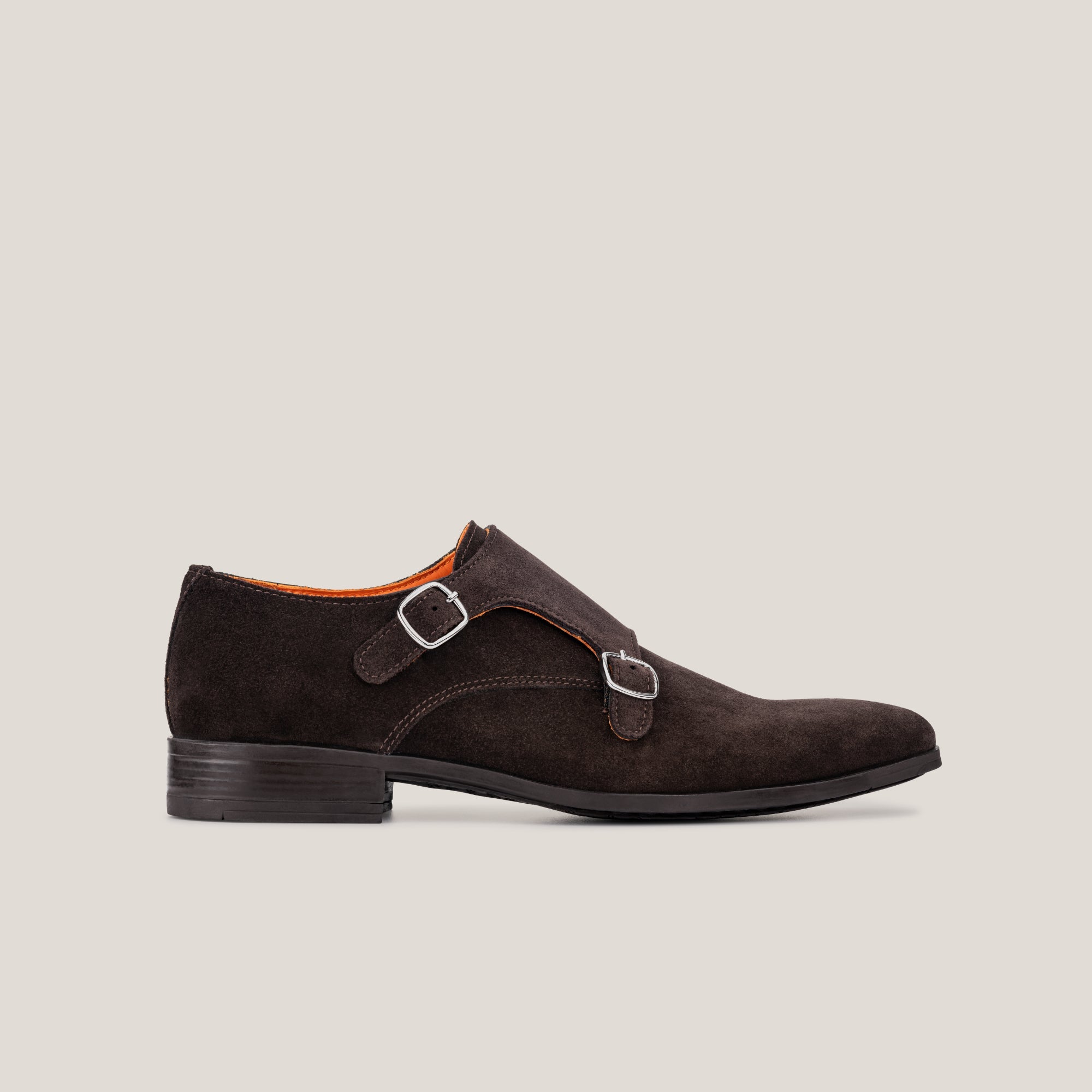 The Monte-Carlo Dark Brown Suede Double Monk Shoes from Reinhard Frans represent classic elegance in footwear. Crafted from premium Italian calf suede in a sophisticated dark brown shade, these shoes feature refined rounded silver buckles. The deep brown tone creates a versatile look that seamlessly transitions from business attire to smart-casual wear with jeans and chinos.