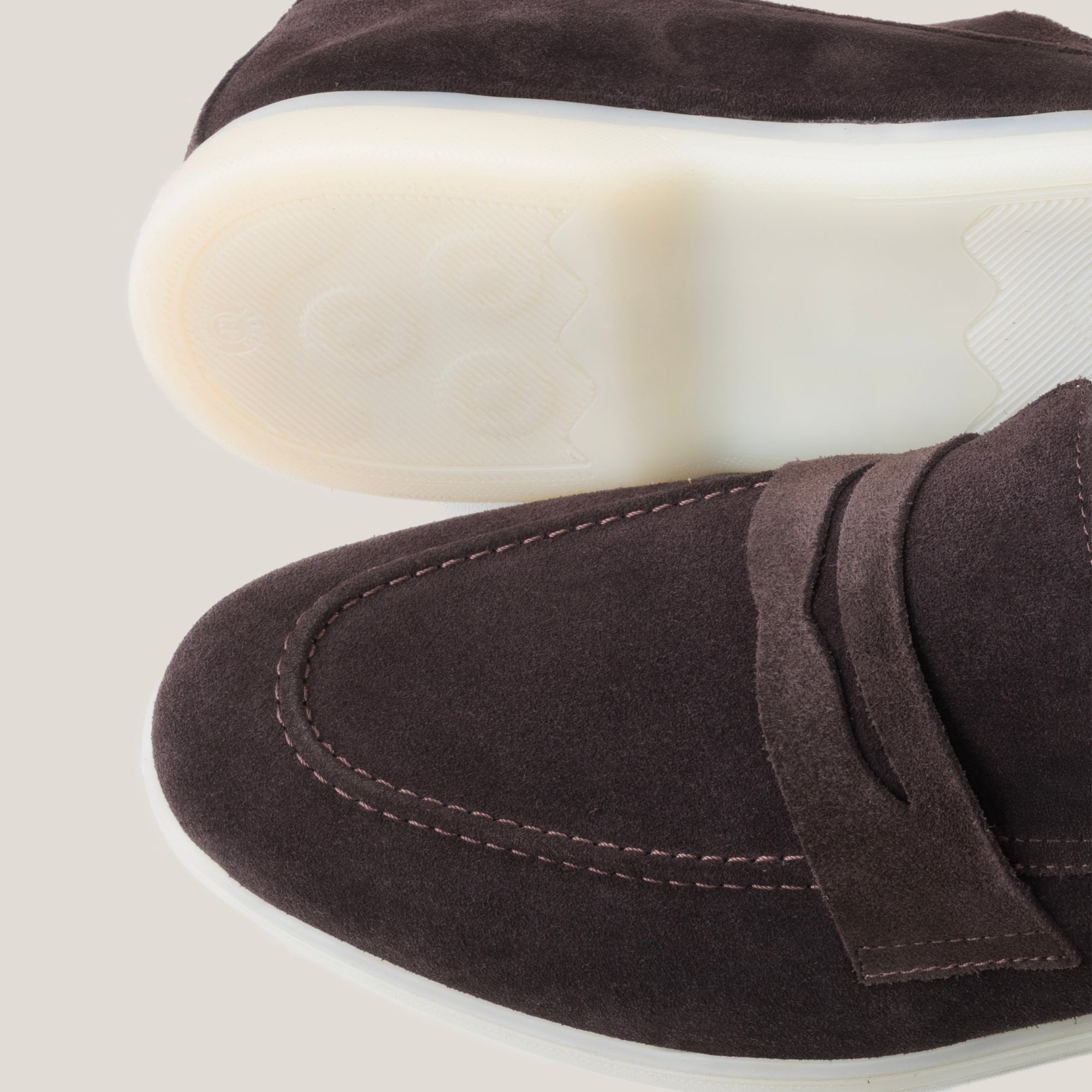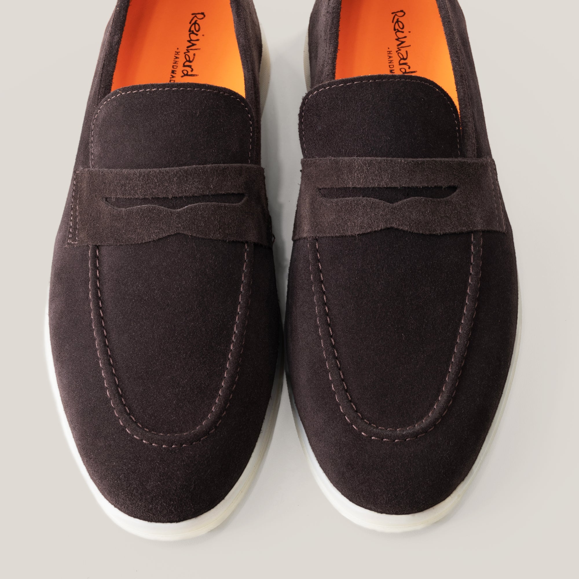 De Portofino Donkerbruine Suède Penny Loafers belichamen handgemaakte luxe zonder het luxe prijskaartje. Deze Smart Luxury Loafers, in een rijke donkerbruine kleur, worden met uiterste precisie met de hand vervaardigd in ons atelier, gebruikmakend van verantwoord ingekocht Italiaans kalfsuède.