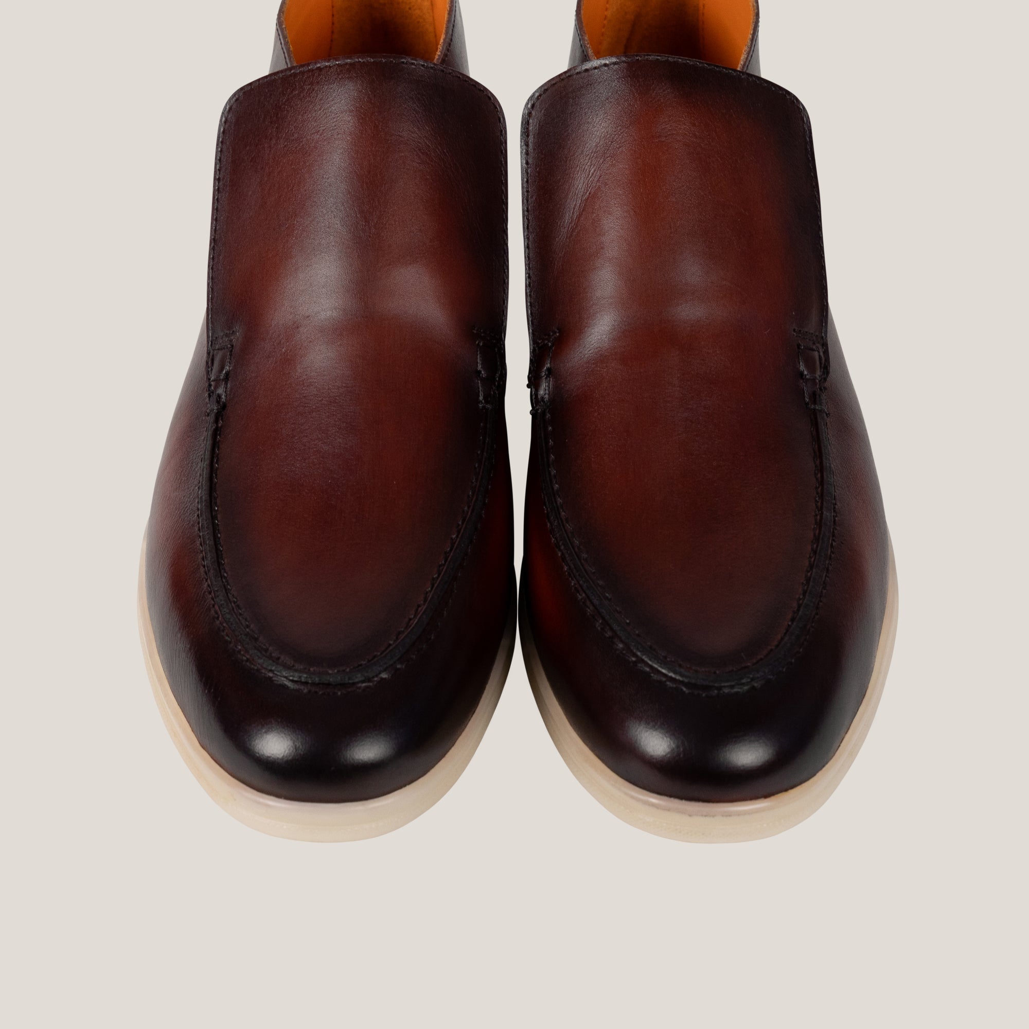 A bold yet balanced expression of the Andora silhouette. This edition in hand-finished cognac patina calf brings warmth, depth, and artisanal flair to our signature slip-on. The colour transitions from a rich amber base to deeper burnished tones at the edges—offering subtle movement and individuality in every pair.